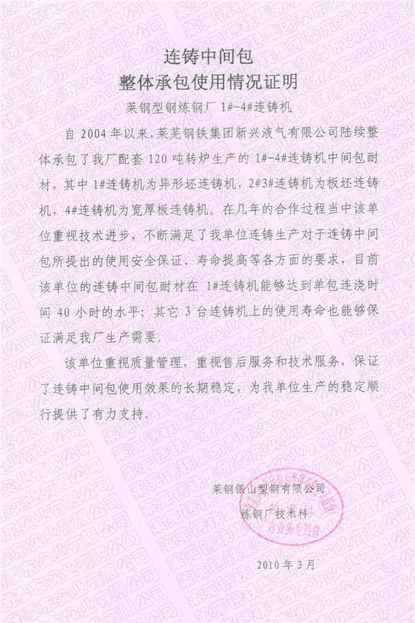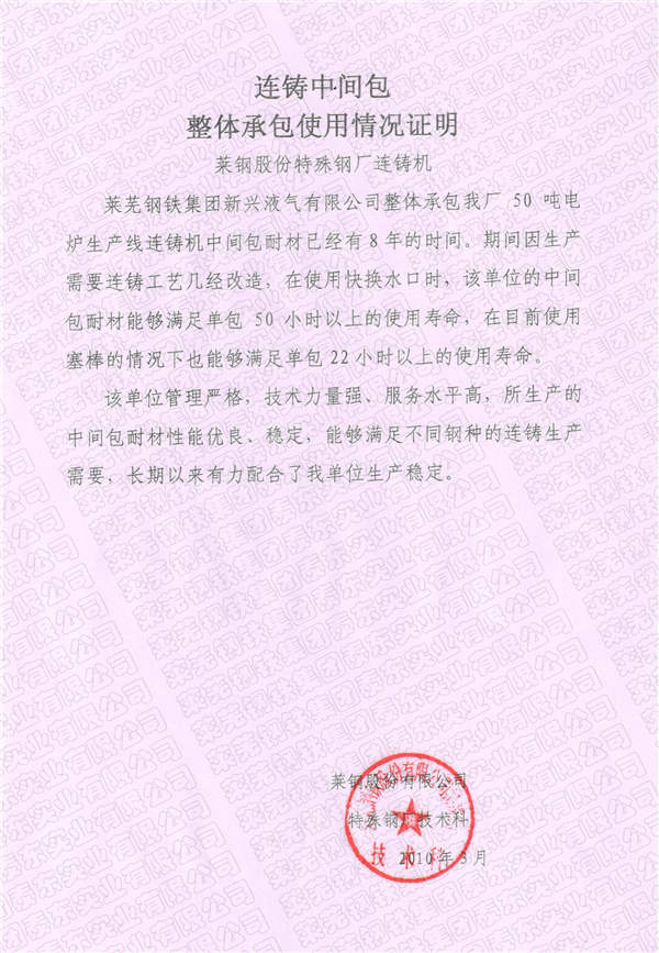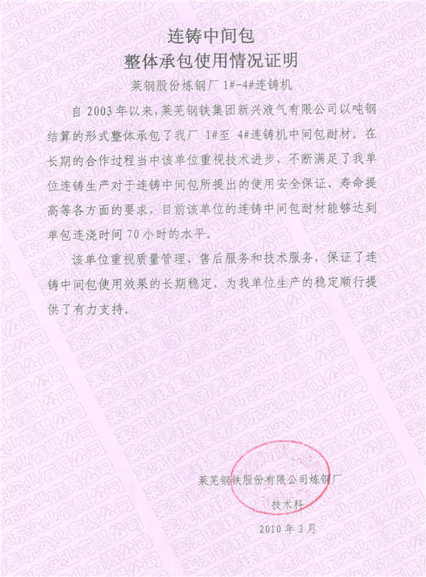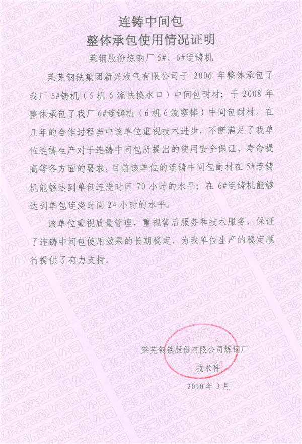 公司以雄厚的技術力量承擔著萊鋼全部12臺連鑄機中間包耐火材料的整體承包服務,經過多年的發(fā)展,公司已經形成了對連鑄中間包耐火材料方案設計、生產、研發(fā)、現(xiàn)場施工及售后服務為一體的綜合體系。目前,在萊鋼中間包連拉爐數更是突破100小時,達到國內領先水平。